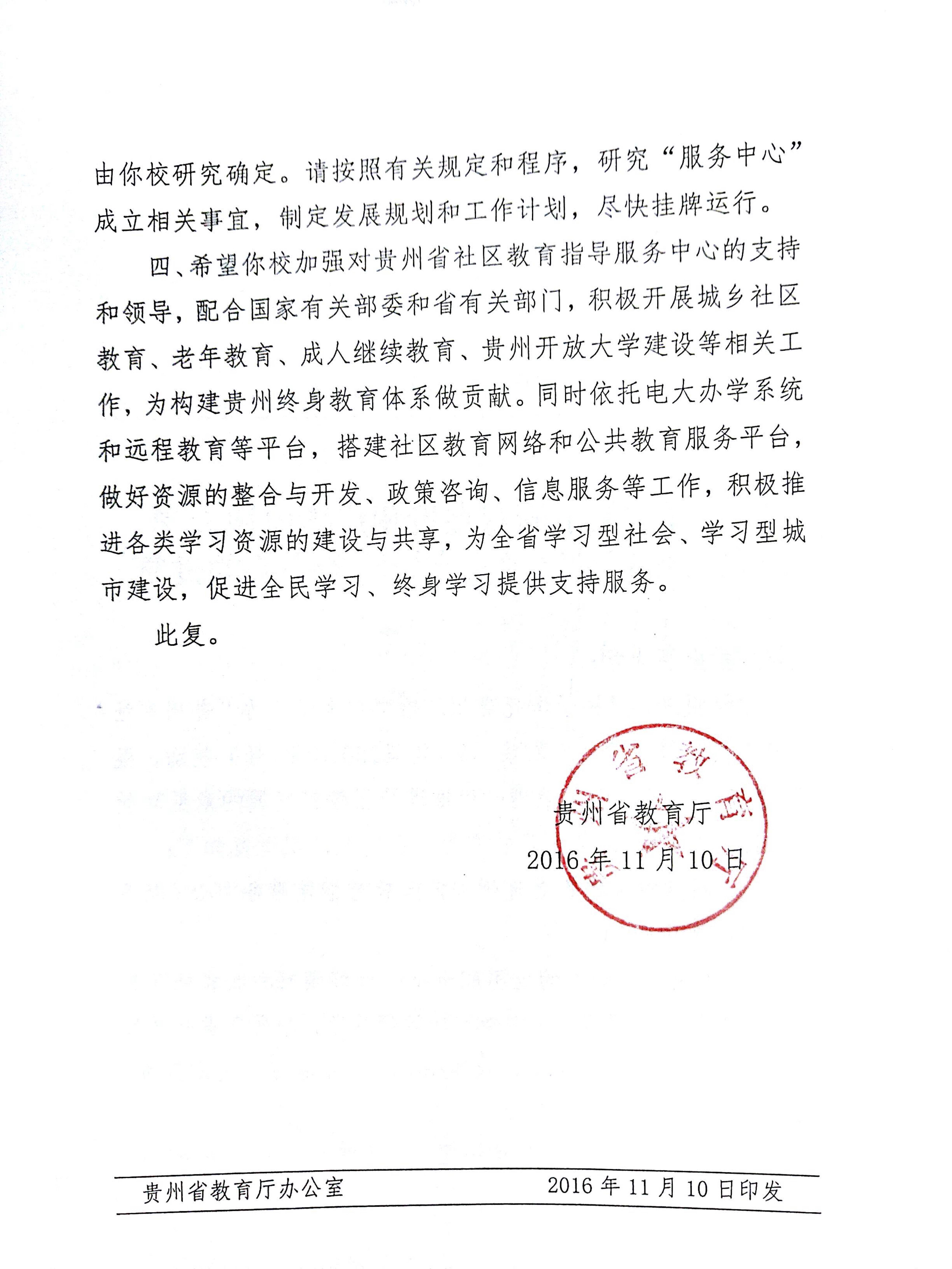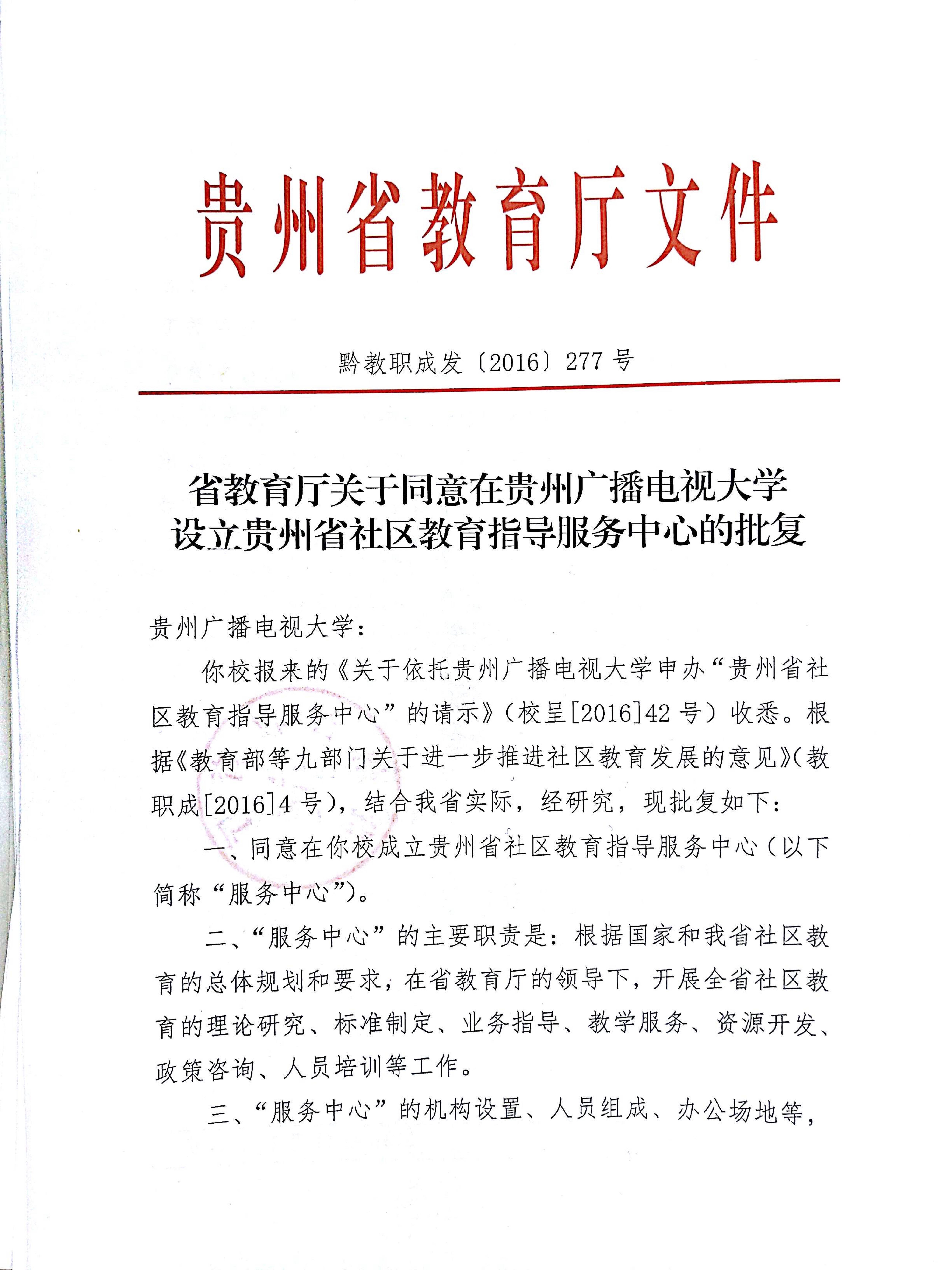 省教育厅关于同意在贵州广播电视大学设立贵州省社区教育指导服务中心的批复