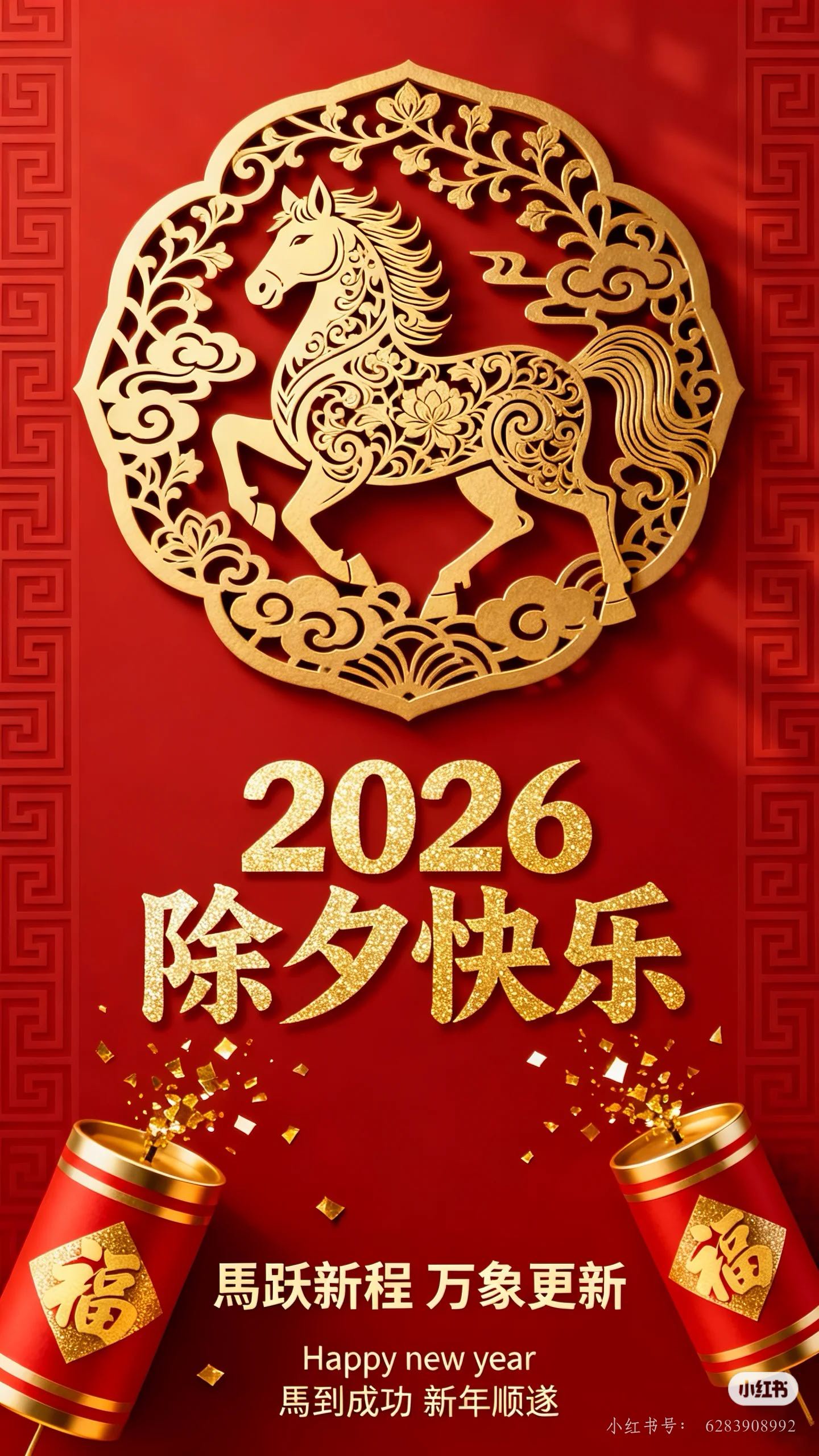 除夕辞旧岁,金马迎新春!祝你在2026年:策马扬鞭奔前程,马到成功事事顺。身体如龙马精神,事业似万马奔腾。除夕快乐,阖家安康!