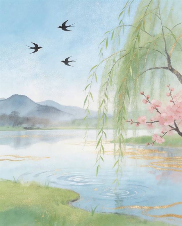 春日湖畔,柳枝摇曳